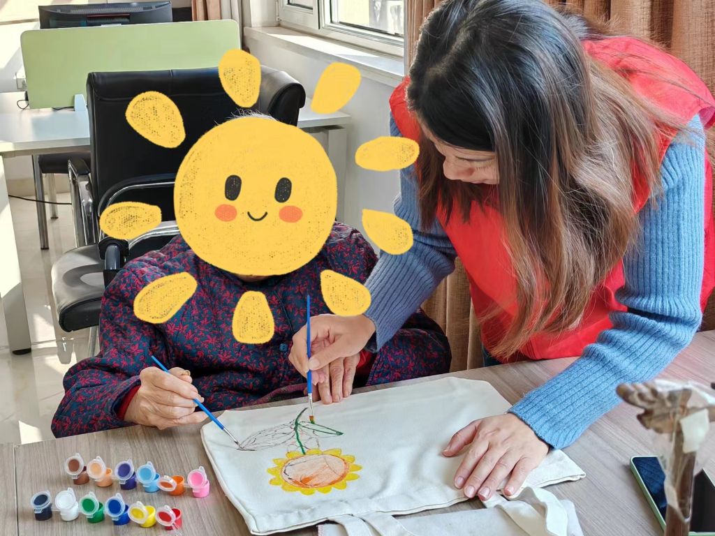 活动中李爷爷拿着笔迟迟不下手,社工察觉询问后,李爷爷回答说:“画不好这个包不就浪费了,我之前是画图纸的。”社工明白李爷爷的顾虑,并迅速给予李爷爷鼓励,以提升他的自信心。尽管他们均为身体残障者,但他们的想象力是无边无际的,他们对于周围的环境,有着独特的看法和情感。最后,他们中的一些人开始根据自己的创意进行创作,而另一些人则根据预先准备好的图案进行模仿和上色。他们使用绘图笔绘制图案的边缘,并用丙烯颜料混合不同深浅的手绘配色,然后上色。这些五彩斑斓的色彩在帆布包上绽放,最终形成了一幅背靠在身上的装饰画,一只只具有独特风格的帆布包便制作完成了。活动结束后,师阿姨讲道:“真的挺不错的,我以后出门就背着它,这可是独一份啊!”