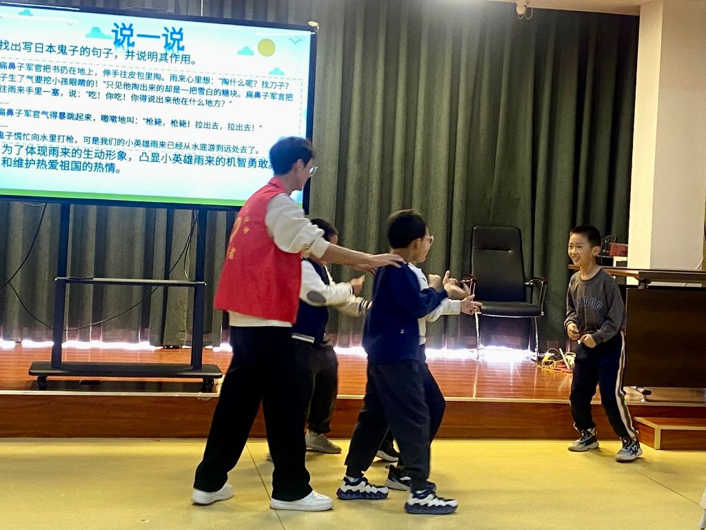 活动在志愿者老师讲述《小英雄雨来》的红色故事中拉来帷幕,孩子们跟随绘本阅读,认识到了峥嵘岁月中的少年英雄,感受到了烽火硝烟的勇气和智慧。随后的“小剧场”环节颇为有趣,社工让孩子们自主选择表演角色,各位小小表演家跃跃欲试、通力合作,将活泼勇敢的“雨来”、坚毅朴实的“李大叔”、狡猾可恨的“日本军官”等人物带到了观众眼前。