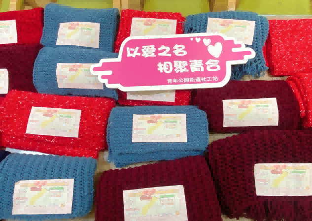 青年公园街道社工站组织辖区志愿服务队10余名志愿者开展编织围巾的服务,两周时间,在寒潮到来之际完成了30余条围巾的编织。社工站立即开展了送围巾爱心行动,与志愿者们将第一批围巾送给辖区工作在一线的环卫工人和困境群众手中。