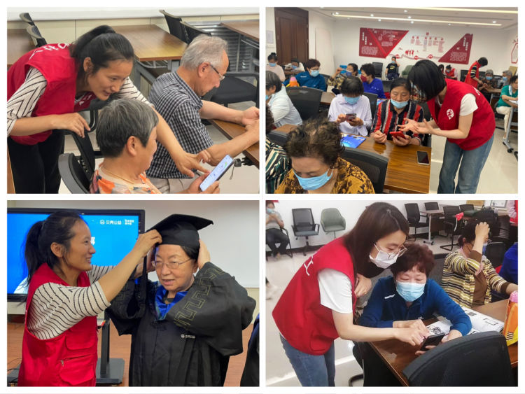 讲师带领各位老年朋友复习了前一节学习的内容。在随后的答疑时间里,老人们还存在着这样那样的遗留问题或新困扰,社工和讲师根据每位老人的个人情况,一对一细心讲解。活动的最后,社工站与贝壳公益为老人们举办了结课仪式。仪式上,大家穿上了学士服,收到了结课证书和小礼品作为本次课程的纪念。收获满满的老人们各个喜笑颜开,精神抖擞。社工为大家记录下了这个美好时刻。许多老年人表示多亏了这个课程,现在出门用手机也不害怕了。