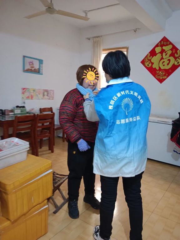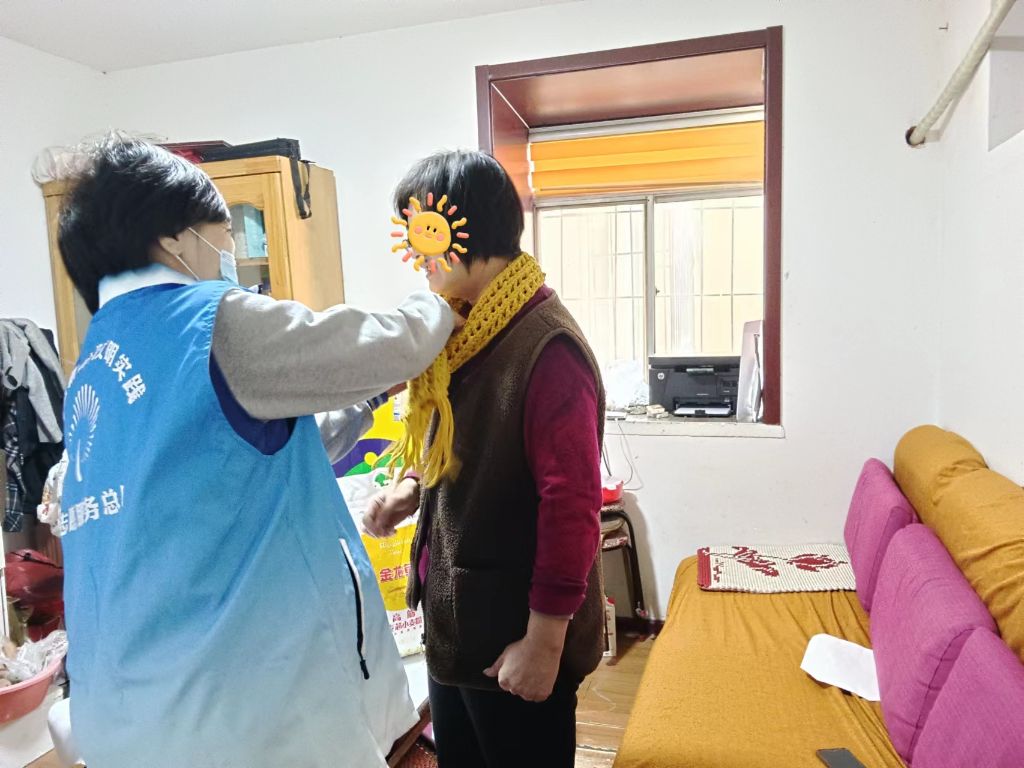 社工们带着面粉和“巧手奶奶志愿者团队”织的围巾走进困境家庭中,社工亲手给服务对象戴上围巾的那一刻,服务对象脸上绽放出灿烂的笑容。当得知是一群70多岁的奶奶们亲手制作的围巾的时候,服务对象在惊讶之余连连表示感谢。随后社工与服务对象亲切交谈,了解他们的经济情况、身心健康情况、家庭成员等,同时围绕低保、临时救助、医疗救助等群众普遍关注的问题进行了法律法规和相关政策的宣讲,积极营造关心关爱的良好氛围。社工主动询问服务对象有什么困难和需求,有一位大姐不好意思的提出她家的窗户太高了,由于身体健康原因自己干不了,可不可以帮忙擦窗户。社工们积极回应,现场进行了简单的清理工作,并承诺近期还会再来彻底清理一遍。