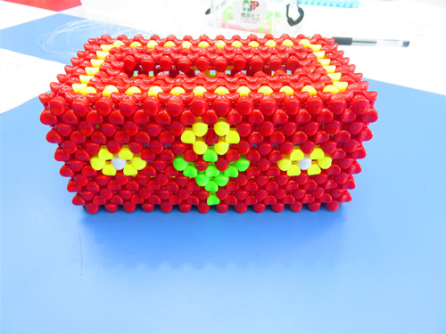 活动伊始,社工亲切的引导成员们相互交流国庆节期间的心得感受,本次手工制作活动也在大家你一言我一语的交流中拉开了帷幕;紧接着社工将提前准备好的“花样抽纸盒”讲义发给每位成员,并根据大家各自的喜好逐一将不同颜色的珠子、线分到成员物料盒中,随后,社工叮嘱成员们一定看好讲义对照成品进行制作并引导大家开始串制,成员们一边说:“还没学够那,就快结束了,我得好好学学这个抽纸盒”、“真快啊,两个月过去了,想想咱们可学会了不少的作品串制,有隔热垫、兔子、两种老鼠、招财猫、金鱼、大金猪”,成员们一边感叹着时间如梭,一边手不停歇的串制着抽纸盒;因抽纸盒步骤繁琐,成员基本都制作了三分之一的部分,今天的课程就结束了,后续两次活动大家将继续进行收尾制作直至完成整个花样抽纸盒作品。