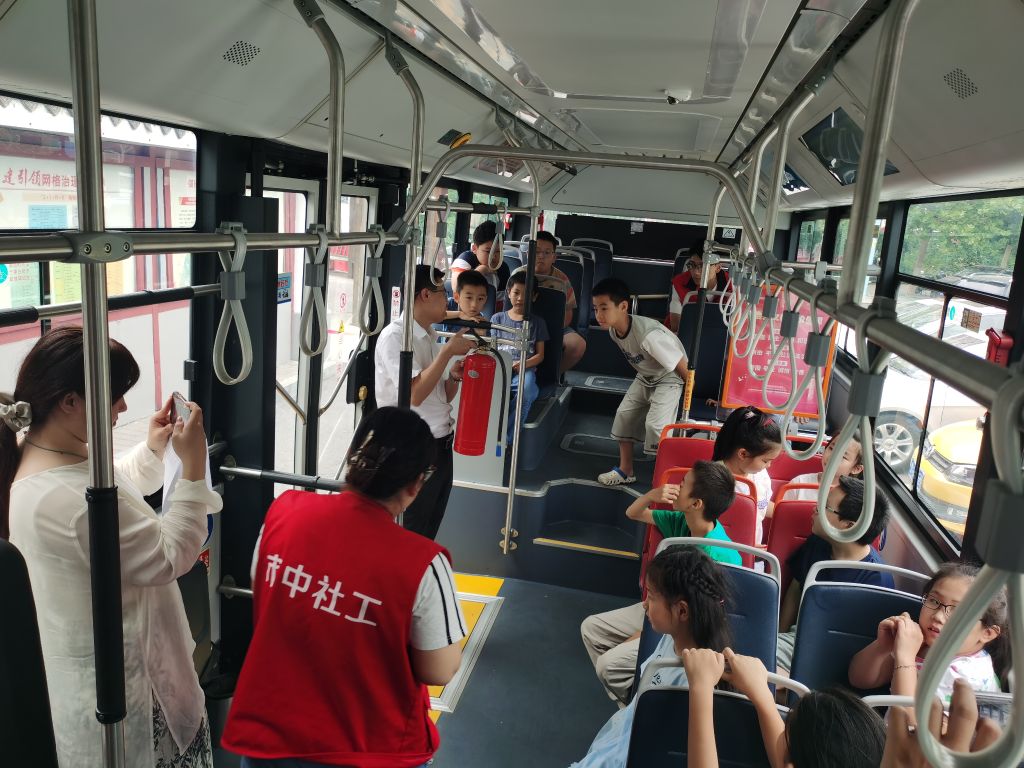 简单的热身环节过后,舜耕街道社工站邀请到济南公共交通集团有限公司南部分公司一队,为小组成员带来一堂生动有趣的公交安全知识课。“坐过公交车的小朋友请举手”,安全课开始后,公交驾驶员李老师先提出一个问题,几乎所有小组成员都举起了手。随后,他图文并茂地讲述了公交出行的各类安全注意事项。活动过程中组员们对公交安全知识表现出极大的热情,为了让小组成员更深入学习到公交车上的,各类应急设施的规范使用,特别向组员介绍了安全锤和灭火器等设施的作用及使用注意事项,组员们听得非常认真,纷纷表示要将所学知识分享给父母和家人。