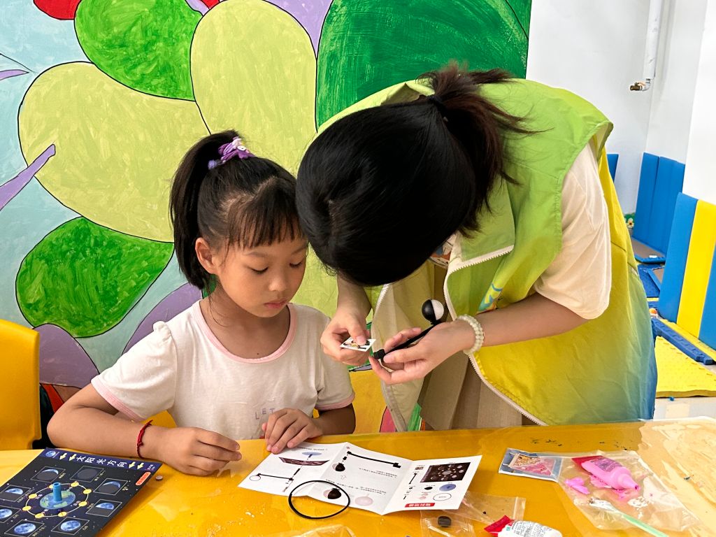 活动伊始,社工首先向孩子们展示了月相仪的组装方法。在社工的耐心指导下,孩子们动手将一个个零件拼装起来,他们的小手虽然稚嫩,但动作却异常认真。组装过程中,孩子们不时发出惊叹,对月相仪的神奇构造充满了好奇。看着自己亲手组装的月相仪,孩子们的脸上洋溢着自豪与喜悦。