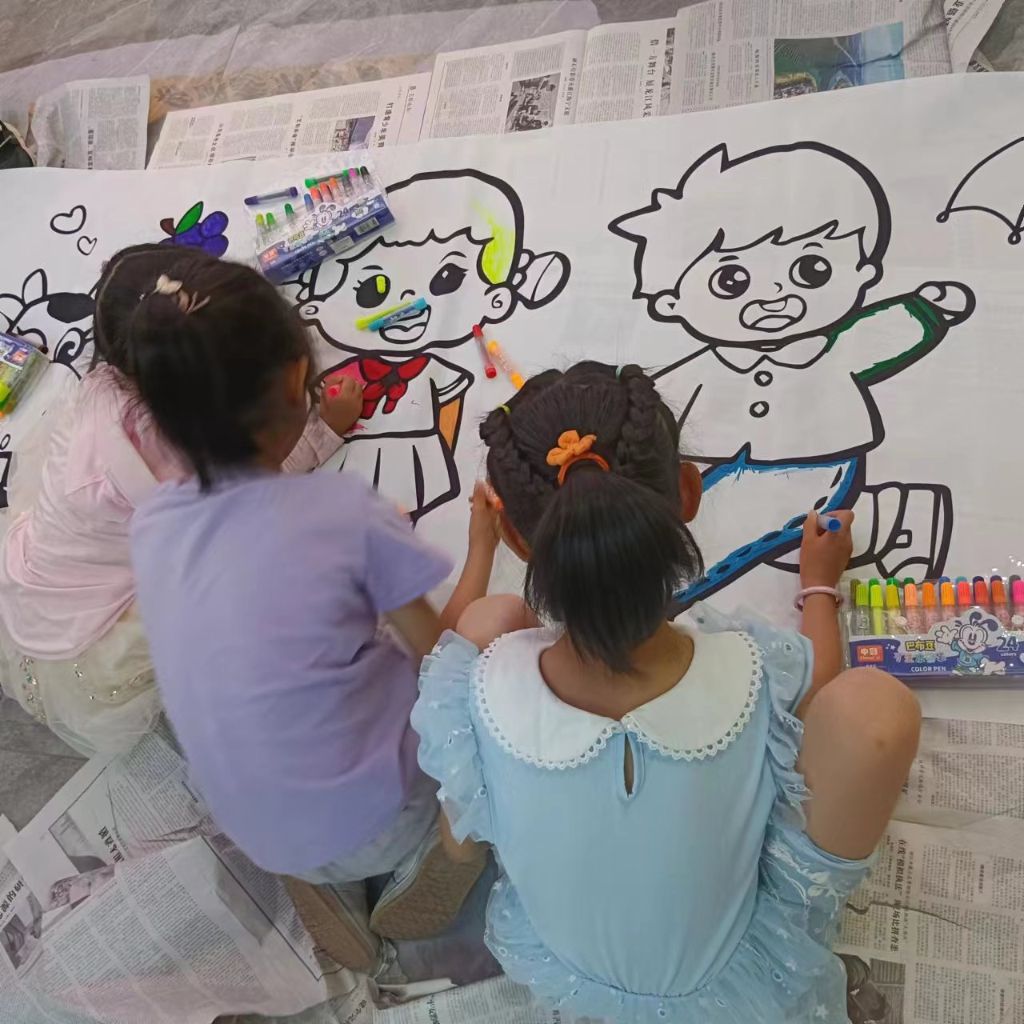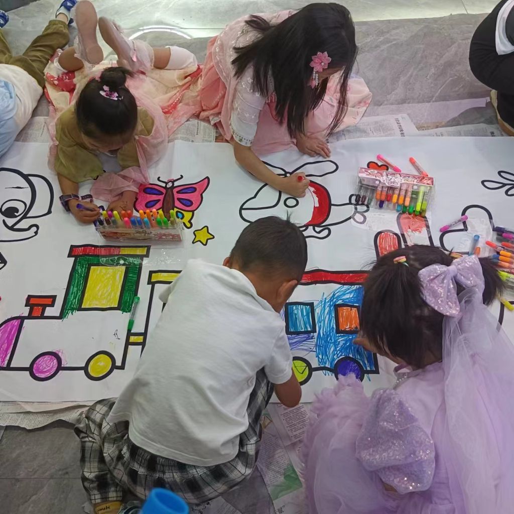 在社工的号召下,越来越多的儿童加入到活动中来,现场气氛非常火爆。社区志愿者和社工分散在画卷周围,蹲下身子当起了他们的小助手,帮着铺平画布、传递彩笔,偶尔提供一些建议。经过一上午的集体创作,一幅“巨型画卷”展现在大家眼前,引得围观的居民连连称赞。