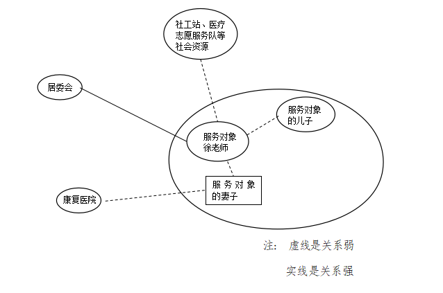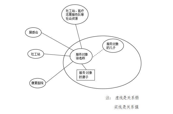 服务对象徐老师(化名),男,今年58岁,肢体二级残疾,用轮椅辅助行动,身患心脑血管疾病,常年吃药,需要定期到医院检查。平时和老伴一起生活,几乎不出门,缺少社会支持网络。儿子和儿媳住因工作繁忙,距离较远很少回来看望,对其无法照顾,平时只由老伴一人照顾,老伴年龄越来越大,因长期照顾服务对象,身体状况欠佳,经常感觉力不从心。服务对象的家庭照护问题日益突现。身体的疾病加上家庭的原因,导致徐老师这段时间心情低落、无助。