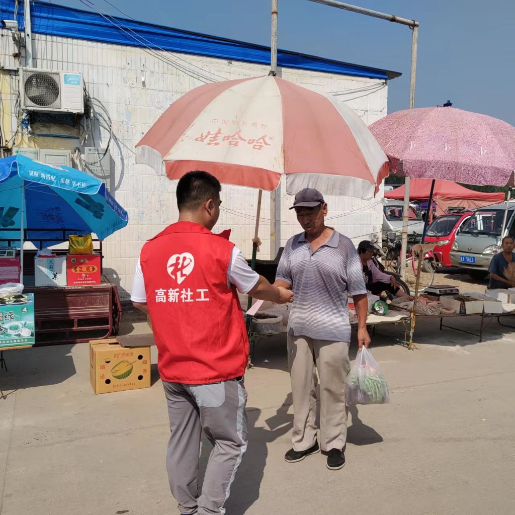 为进一步发动更多社会力量来关爱 、关注流浪乞讨人员, 提⾼居⺠群众对流浪乞讨人员的救助管理意识,加强居民群众对流浪乞讨人员 社会救助政策的了解, 2023 年8月11日 , 遥墙街道社工站协助民政办在辖区遥墙大集开展“夏季送清凉 关爱流浪乞讨人员”服务宣传活动, 号召广大居民群众共同关注、关爱流浪乞讨⼈员。