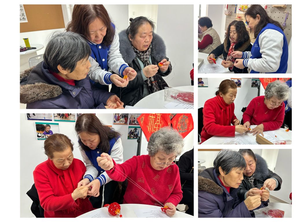 活动开始前,社工首先为居民朋友们介绍了元宵节花灯的来历。古时候的花灯是寓意驱魔降福、祈求光明的,也是代表人们对平安团圆的期盼,希望生活能够和顺、幸福、美满。然后,社工向大家展示了一个红红的晶莹剔透的串珠灯笼成品,着实吸引了居民们的眼球。前来参加本次活动的居民对于串珠或多或少都有一定的功底,但对于灯笼则是第一次接触,社工将制作灯笼的材料分发给大家,并详细讲解了灯笼的制作方法、步骤及注意事项。居民们认真聆听,并按照社工的示范一步步操作,左过1右串3,左过2右串2......纤细的鱼线在红彤彤的珠子之间来回穿梭,大家边学边做,现场气氛热闹又温馨。