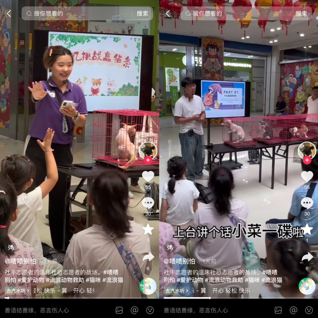 最后一个环节是流浪动物领养,现场由志愿者带来7只猫咪,对于有意向领养的家庭,由志愿者进行审核、签约,最终现场领养了5只猫咪。