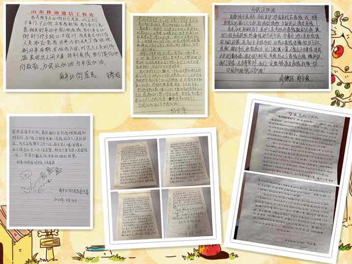 新型冠状病毒疫情期间,槐荫民政社工心引力项目组在配合南辛庄街道做好疫情防控工作的同时,积极动员辖区老年志愿者、小组负责人等力量,以一种特殊的“爱”,为在防疫一线奔波忙碌的医护工作者、社区工作者、社工等加油鼓劲。“武汉加油!中国加油!”是他们真挚的情感,隔离病毒,但隔离不了的是那一份滚烫的爱。