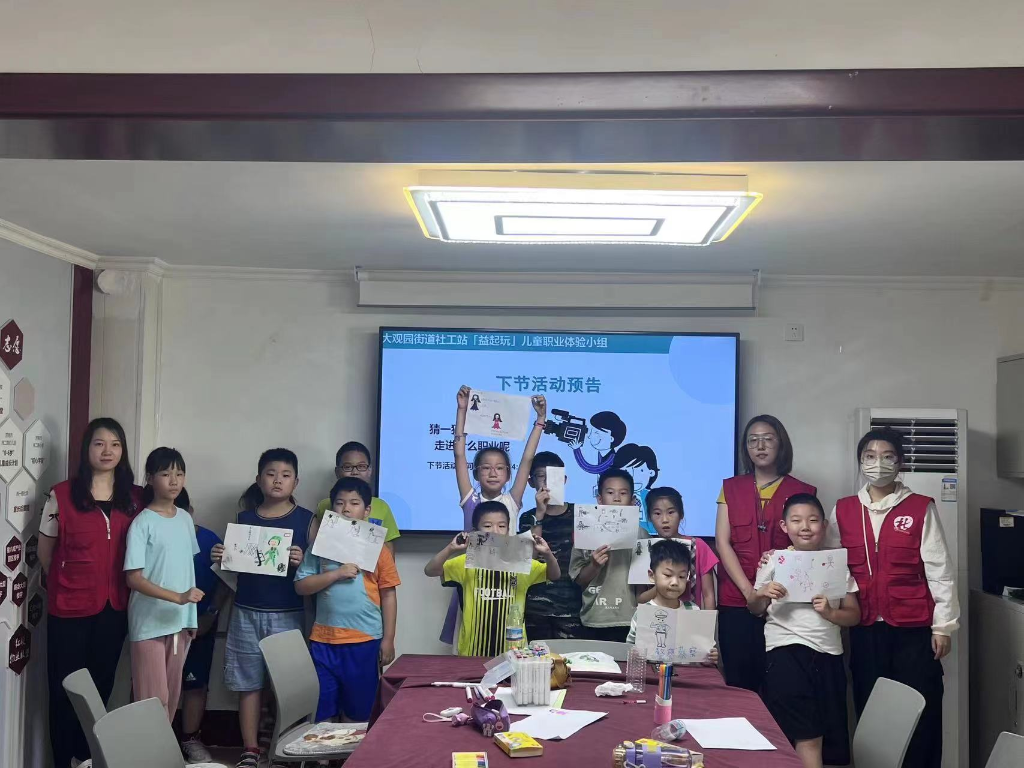 为了提升儿童对社会职业的认识,树立健康平等的职业观,加强对未来职业生涯的规划和实践,充实辖区儿童暑期生活。大观园街道社工站以成长小组的形式嵌入儿童职业体验及生涯辅导教育,大观园街道社工站以纬一路社区为中心组织开展了“益起玩”儿童职业体验小组活动,活动共分为六小节。