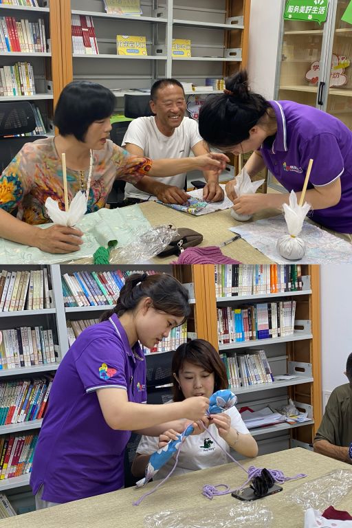 交流会上,社工站向新老志愿者互相介绍各自特长和参加过的志愿服务项目,引导志愿者分享自己的志愿服务故事。随后,社工总结了上半年开展的志愿服务活动具体成效以及志愿者们的积分情况,将“福星互助驿站”志愿服务队产出的手工作品义卖收入明细进行公布,感谢队员们对社区的贡献、对社工站“暖心计划”项目的支持,同时号召大家带动更多的居民加入到志愿者队伍中来。最后进行半年度积分兑换,本次志愿者积分兑换形式为艾草锤手工制作,志愿者们按照社工的讲解步骤,打开艾草包,先铺平布料,将艾草包扎紧,用布料包裹住,然后捏成一个紧实的圆形,最后拿出绳子将其紧紧缠绕成柱形。伴随着艾草的芳香,一个个精致的艾草锤就做好了,大家拿着自己亲手制作的艾草锤,往肩周和后背敲打着,敲走了身上的疲惫和精神的压力。