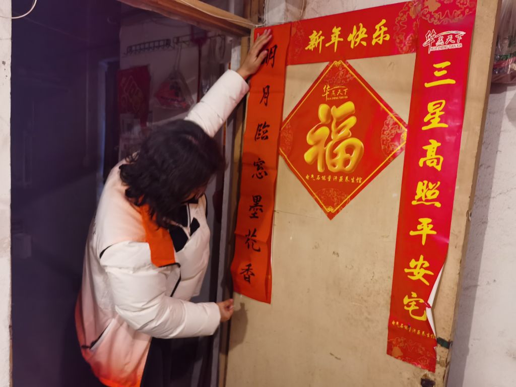 随后,社会工作者和社区工作人员来到因患病导致失能的独居老年人王老师(化名)家中,询问节日期间是否有护理员提供照料,得到肯定答复后,社会工作者叮嘱服务对象保重身体,按时服药,保持健康愉悦的心情。紧接着,社会工作者帮助老人擦拭房门,把社区社会组织骨干亲自创作的春联张贴在房门上,传递出“除旧迎新”的美好寓意。