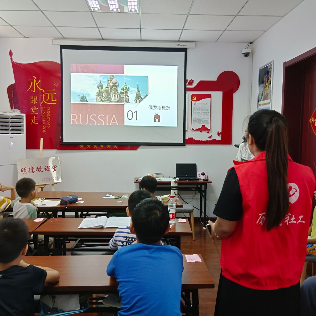 课堂上,社工从以俄罗斯为例,从国家概况、国旗国徽、地理位置、饮食习惯、风俗文化等方面具体展开讲解,通过随机提问和畅所欲言的方式活跃课堂氛围。俄罗斯是世界上面积最大的国家,地跨欧亚大陆,首都是莫斯科,俄罗斯人喜食酸和辣,爱喝烈酒最出名的是伏特加。“你们看俄罗斯的国土板块能联想到什么?”社工提问道,“我觉得像一只趴着的小猫,正在翘着尾巴。”“我觉得像一只蝎子,右上角那块是它的尾针!”孩子们争先恐后地发言,都想把自己的想法分享给大家听。社工则认真聆听,积极回应,同时维持好现场秩序。在欢乐的课堂氛围中,孩子们也学到了很多知识,也理解了不同国家的不同文化差异,更加增强了孩子们的学习兴趣和积极性。