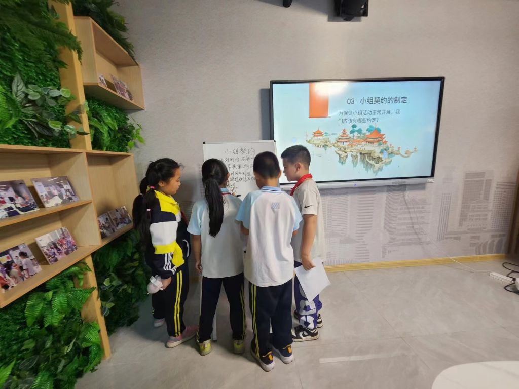 小组契约在于规范小组内容,确保后续小组工作的有序开展,在制定过程中,需要小组成员全部参与、共同制定。在本次小组契约制定阶段,社工积极引导组员共同讨论小组成员行为规范,以“头脑风暴”形式带领组员各抒己见,并将自己所思所想书写在小组契约白板中。“有问题举手发言”、“要尊重他人”、“不要迟到”……你一笔我一划,小组契约逐步确立起来。