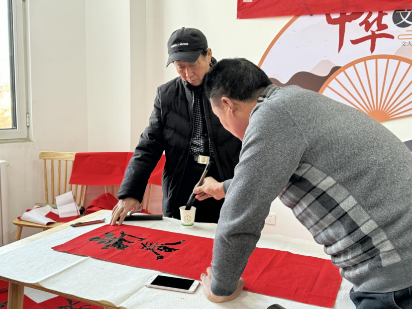 活动现场,书画老师们把新年的祝福融入笔端,老师们个个凝神提笔、挥毫泼墨,全神贯注地创作下一副副吉祥喜庆的春联和饱含神韵的福字。社工和志愿者则以协助书画老师进行绘写和铺晾春联的方式参与到活动中来,为书画老师们提供力所能及的帮助,同时为前来参加活动的辖区居民送上写好的春联福字,居民们手捧精美的春联和福字喜笑颜开、赞不绝口,空气中弥漫着春节到来的欢乐气氛。