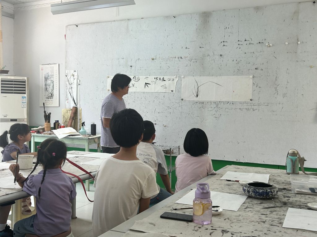 随后徐老师通过简单的创作让小朋友们领略国画的魅力。通过毛笔蘸取墨汁,随后简单的几笔勾勒,一副栩栩如生的作品便油然而生,随后,老师又对这副简单的作品进行介绍,从整体构图设计到线条的刚柔并济,让小朋友们逐渐感受到国画的魅力,认知上也逐渐发生转变,从最初看似几根简单的线条到逐渐成为兰花,成为视觉上的盛宴。