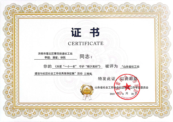 近日,2023年度山东省社工站建设与社区社会工作优秀案例征集大赛结果公布。曹范街道民政社工站申报的关爱“一小一老”,守护“朝夕美好”服务项目荣获三等奖,也是章丘区唯一获奖项目。