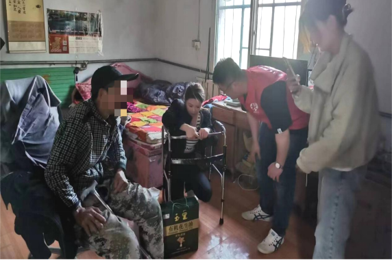 曹范街道民政所所长李师强带领社工下村为服务对象发放辅具及生活用品