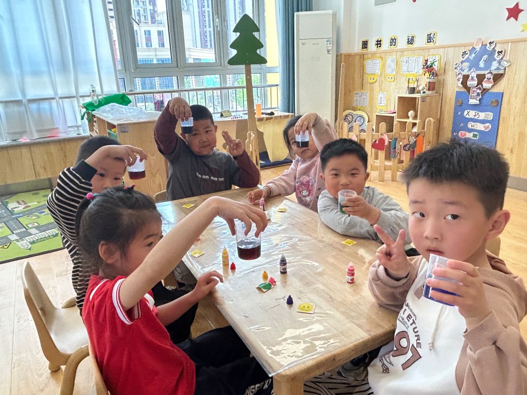 活动以趣味“变色魔术”开场,社工在清水中加入依次红黄蓝色素后变幻出缤纷色彩,迅速点燃孩子们的好奇心。与此同时,社工借助多媒体,以生活中常见的彩色印刷、绘画调色为例,简明讲解色彩混合的基本原理,帮助儿童建立“色彩碰撞产生新可能”的认知。实验环节中,孩子们分组使用滴管、量杯等工具,将红与黄、蓝与绿等颜色两两混合,观察到橙、紫、青等新色彩的诞生,并为自己调配的颜色起了“阳光橙”“星空紫”等充满童趣的名字。社工全程指导安全操作,引导孩子们记录颜色变化细节,鼓励大胆尝试粉色与绿色、蓝色与橙色等创意组合,探索不同比例下的色彩效果。最后,成果展示时,各组将配色作品陈列在“彩虹展板”上,代表们分享配色思路:“黄色加蓝色像春天的小草,所以叫‘嫩芽绿’!”社工通过互动提问,帮助孩子们总结“颜色比例不同会影响混合结果”等发现,加深对科学原理的理解。