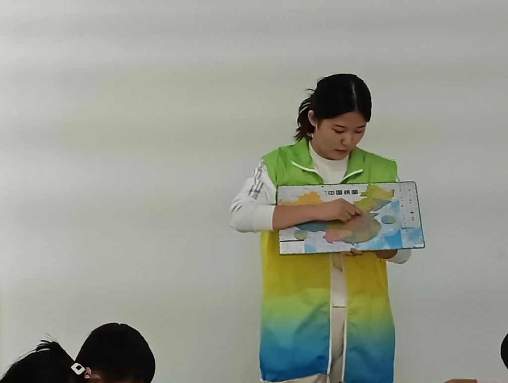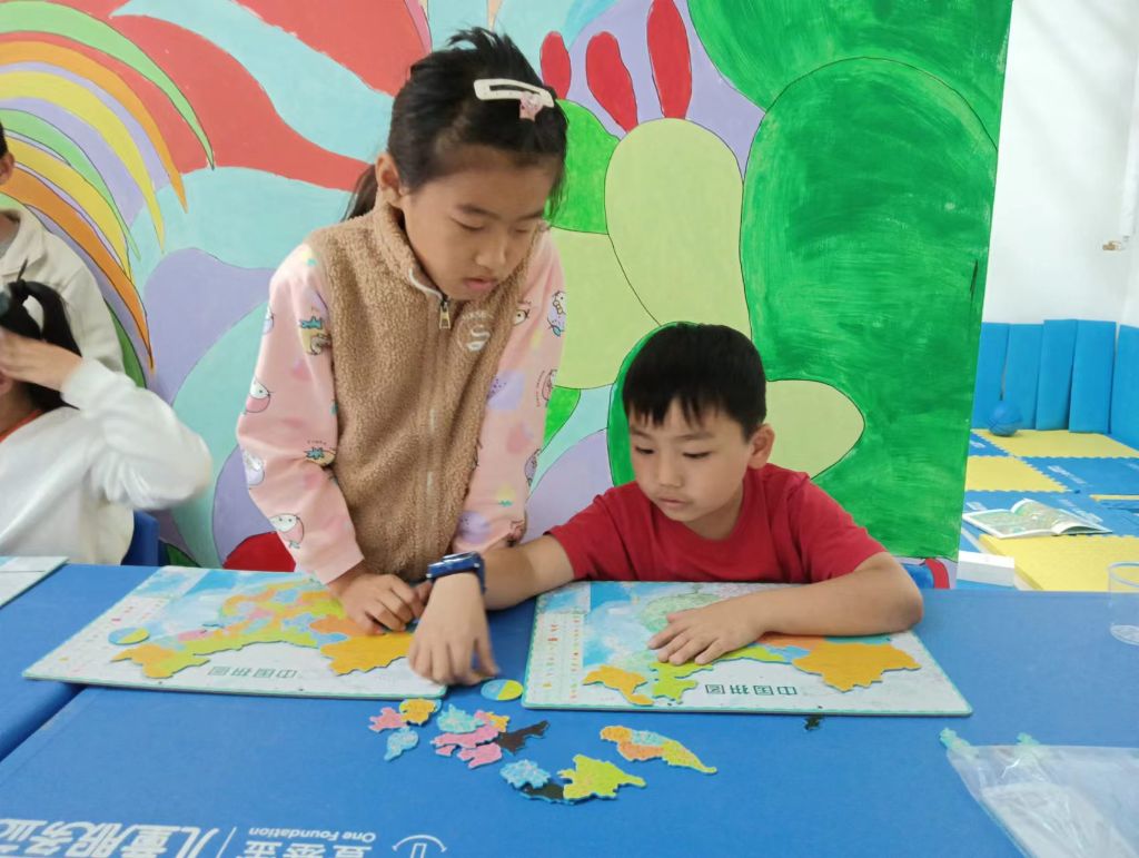 活动伊始,社工引导孩子们利用中国地图,分享自己所在的城市地理位置。孩子们的眼睛里闪烁着好奇的光芒,他们争先恐后地指出自己家乡的位置,有的孩子甚至能详细描述家乡周边的城市和省份,展现出对地理知识的浓厚兴趣。