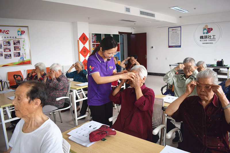社工通过调研发现住养老人大都非常看重对于视力的保护,许多老人告诉社工自己有每天做眼保健操的习惯,但是社工仔细观察发现老人们的眼保健操都很不标准,对于相应穴位的位置也不了解。5月24日,众诚悦银龄养老社工项目组社工在福利中心三楼老年大学开展了“为革命,保护视力”趣味养生小课堂活动,希望使老人可以做好眼保健操、正确保护视力。