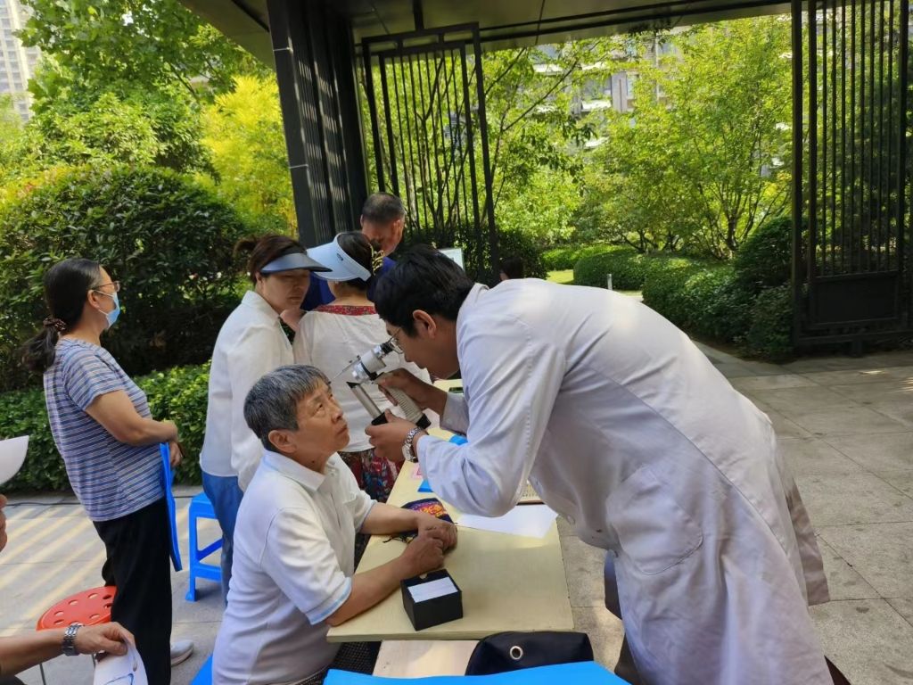 活动伊始,居民早早地来到现场等候,志愿者为居民发放预防眼部疾病宣传资料,驻站社工安排大家有序排队,确保活动顺利开展。眼科医生首先为老年人们进行视力检测,填写眼科检查表,随后,医护人员用专业设备为居民进行视力和眼底检查,针对检查结果耐心分析情况,量身定制治疗方案并给出保护眼睛的建议。医生用通俗易懂的语言,细心地为老年人讲解眼部疾病发生原因、症状、如何预防和治疗白内障等老年人眼部疾病。