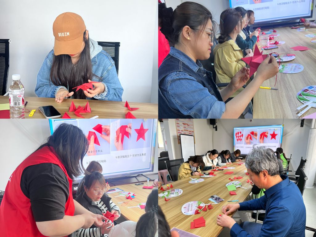 最后,20分钟的手工环节,社工分发彩纸、剪刀、胶水等工具,通过示范讲解五角星的折叠技巧,引导居民通过折纸、裁剪、粘贴等形式,创作出一个个立体五角星,通过手工环节,增强了社区居民参与成就感,加强了社区居民的情感联结。