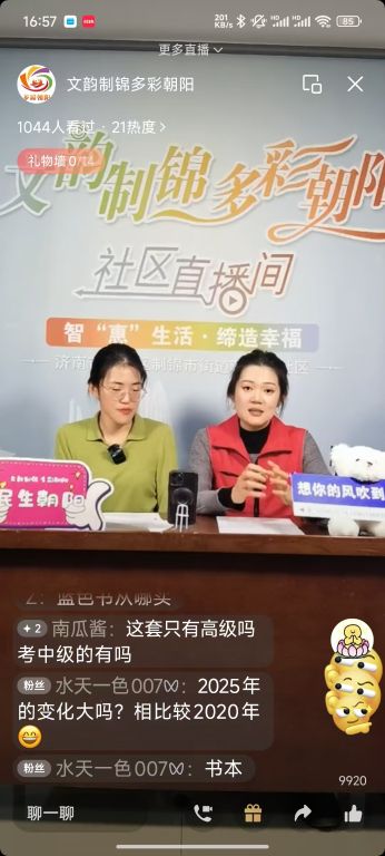 为助力社区居民更好地备考社会工作证书,提升社会工作者的专业素养与实务能力,近日,制锦市街道社工站联动朝阳街社区,特邀济南社会工作协会高级社工师开展了一场别开生面的社会工作证书备考直播活动。此次活动通过“多彩朝阳”线上直播间,以“直播+互动”的形式为备考者提供精准有效的复习指导与实战技巧,吸引了1200余人次在线参与,直播间点赞量突破1万。