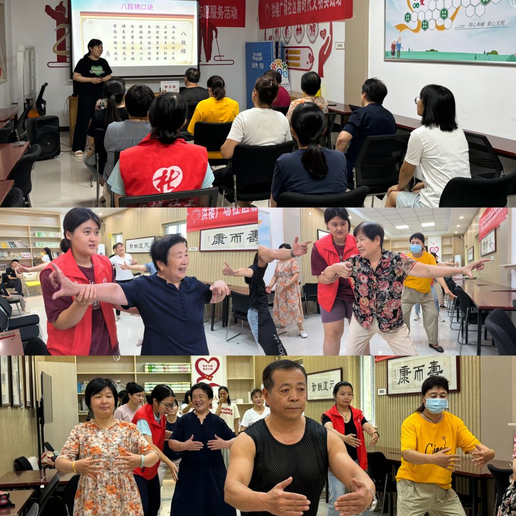 在第16个“全民健身日”到来之际,为培养社区居民科学锻炼的习惯,增强健身养生意识。8月8日,洪家楼街道社工站联合洪楼广场社区开展“活力八段锦,健康伴我行”全民健身活动。