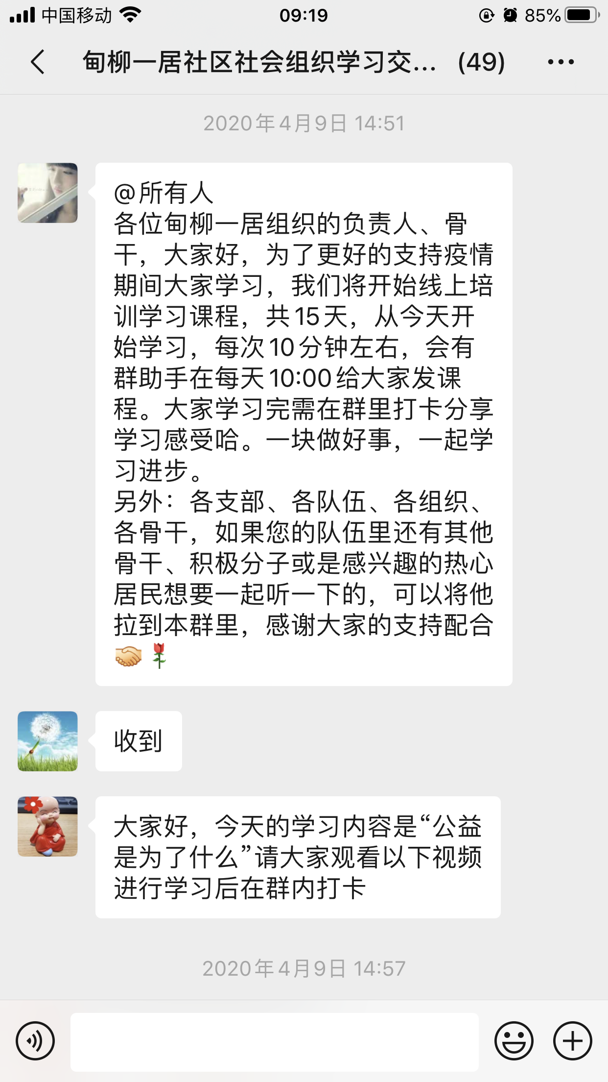 4月初,历下善治提供了社区社会组织学习资源。4月9日,社工在甸柳一居社区社会组织学习交流群内发布网课,开启“云学习”。每天上午10:00,网课内容分享至群内,组织骨干学习后自觉打卡,形式不限于文字、笔记、视频。网课内容涵盖:公益、社造理论、志愿服务、志愿精神、服务技巧等方方面面。