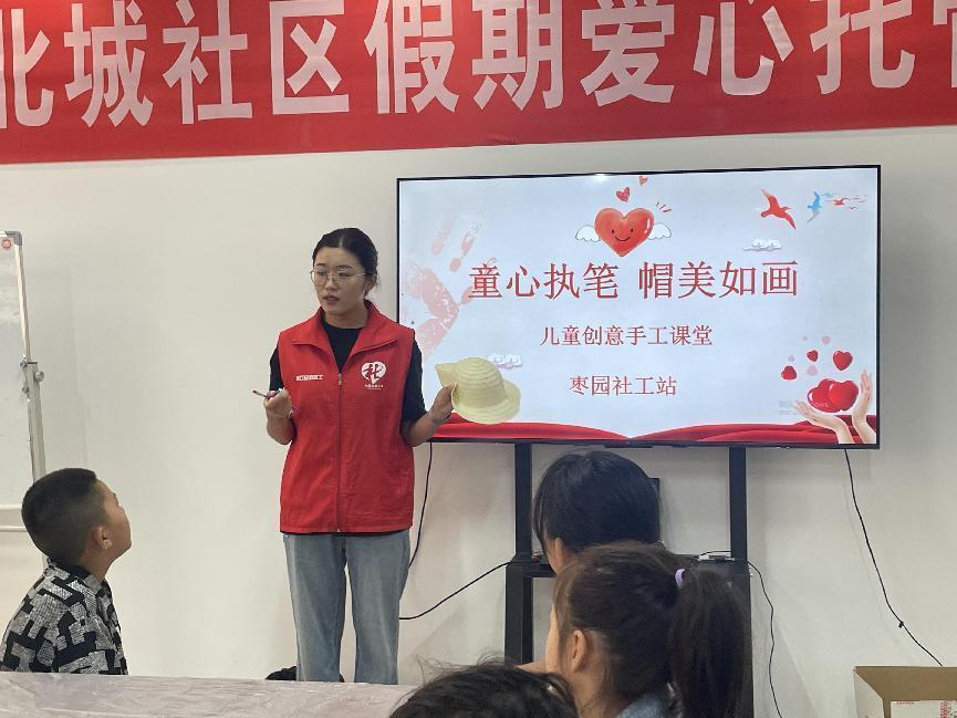 为切实做好儿童友好型社区创建工作,增强儿童及家庭对社区的归属感,促进儿童全面发展,7月25日,章丘区枣园社工站在绣源北城社区与大学生志愿者为孩子们带来了一场别开生面的草帽创意绘画活动。