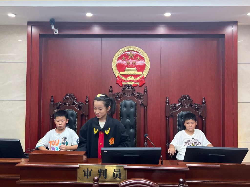 区法院立案庭干警朱建宇带领儿童和社工一同走进庄严肃穆的人民法院,在门口法警对小朋友们进行安全检查,大家在朱警官的带领下前往速裁审判庭,在审判厅内社区儿童通过角色分配,进行模拟法庭,身穿法袍化身正义小法官,代入小小书记员、律师、原告、被告等角色,体验审判过程的严谨与重要性。在法院大厅,为更好让儿童清晰了解审判流程,朱警官还带领大家观看了庭审录像,更直观深刻的让儿童了解了庭审流程。