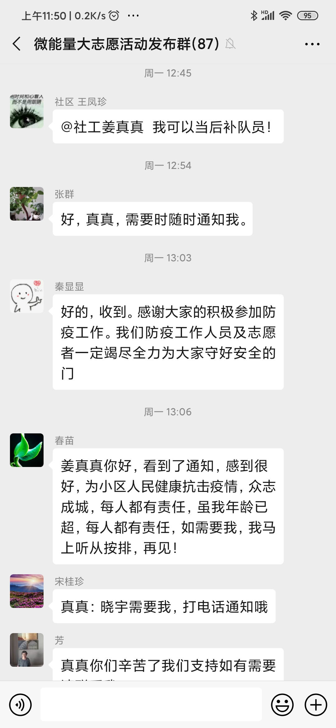线上工作从参与社区疫情防控知识宣传普及开始,项目组通过前期发布的社区疫情防控招募令社区居民积极响应报名后,社工在筛选招募的防控疫情志愿者过程中,针对超龄的老年志愿者,社工鼓励其参与线上活动中。老年志愿者助力社工通过微信群、QQ群等渠道向居民做好政策措施解读、解答居民疫情期间问题、提供心理援助缓解居民紧张情绪,做好网络舆情引导工作,不造谣、不信谣、不传谣,不在网络、朋友圈、微信群随意发布未经证实的虚假消息,主动参与辟谣工作,举报不实信息。