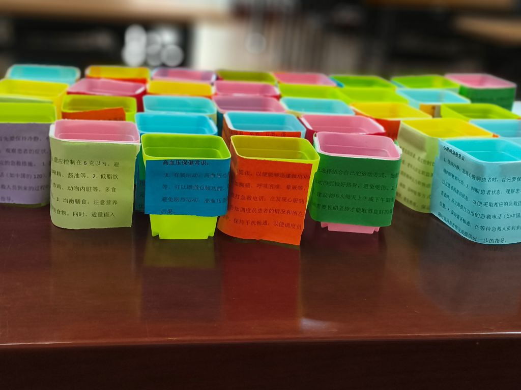 活动开始前,社工与志愿者们制作了彩色温馨纸条贴于花盆上,其中包含多种春季养生知识,针对老年人春季容易引发各种疾病表现出的症状和如何预防疾病,重点讲解了心血管疾病、冠心病、心绞痛等一些常见疾病知识,并现场嘱咐老年人家中要常备脑血管疾病药,保持良好的心态、充足的睡眠。参加活动的老人们对这充满关心关爱的创意给予称赞。