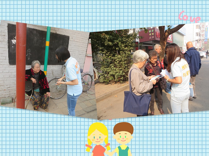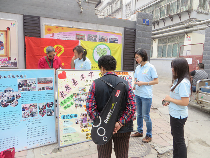 根据北辛西街人员流动量大,分布较为分散的特点。项目组采用了“定点招募”和“走街串巷”两种方式进行宣传,由两名社工在固定位置安置展板,对围观居民进行活动宣传和报名登记,同时另两名社工携带宣传折页深入社区各个街道,使更多的辖区居民了解到社工服务。