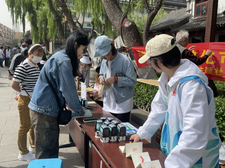 “文创义卖”摊位。“县西行”地名文化志愿服务队设立了文创摊位。摊位上有精美的文创产品,如别致的宣纸扇和富含历史韵味的景点印章,更有深厚的社区历史、社区特色。不少游客被公益市集的热闹吸引,纷纷前来观赏,有的游客在听到志愿者们介绍这次的义捐义卖募集资金活动后,表示更加愿意参与这项活动了。在志愿者们的协助下,游客们一边欣赏着文创产品一边在宣纸册上盖上景点印章,为济南之旅、大明湖之旅留下美好印记。