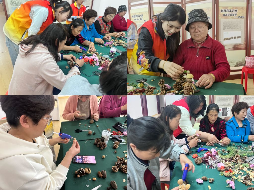 接下来,在90分钟坚果手办DIY环节中,社工和志愿者组建协同服务小组,实施分层创作指导:既有面向老年群体的基础造型教学,也有针对中年群体的创意设计挑战。现场居民将松塔化作松鼠蓬松的尾巴,用开心果拼接出猫头鹰的脚丫,这场新奇体验让现场的每个人都笑语不断,一个个憨态可掬的作品也悄然编织着邻里和谐的魔法。