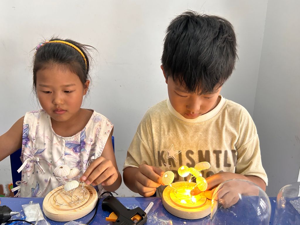 在云游的旅程告一段落后,孩子们迎来了另一场精彩纷呈的活动——手工制作。每个孩子都拿到了一个水母灯材料包,他们迫不及待地打开包装,开始动手制作。他们的手指灵巧地将灯线织成五条灯条,胶枪在他们手中轻盈地舞动,将一个个精致的海胆壳固定在灯条之上。接着,孩子们用白色的黏土巧妙地覆盖住底部交错的灯线,并在其上均匀铺撒了一层细白的沙粒。随后,他们用胶水精心地将小珍珠和贝壳点缀在沙粒之上,为作品增添了一抹海洋的韵味。每个海胆壳上,孩子们又细心地粘上了三条珠串,使得整个水母灯更加璀璨夺目。在灯光的照耀下,这些水母灯闪烁着如梦似幻的光芒,将孩子们的创造力和想象力完美地展现出来。他们自豪地举着自己的杰作,脸上洋溢着满足和骄傲的笑容,这一刻,他们的创造力得到了最生动的体现。