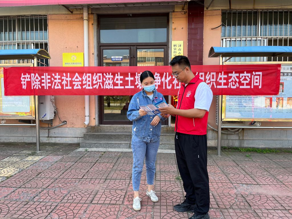 为进一步打击整治非法社会组织,铲除非法社会组织滋生土壤,净化社会组织生态空间,保护社会公众合法权益。2023年9月15日,鹏泉街道社工站开展打击整治非法社会组织宣传活动。