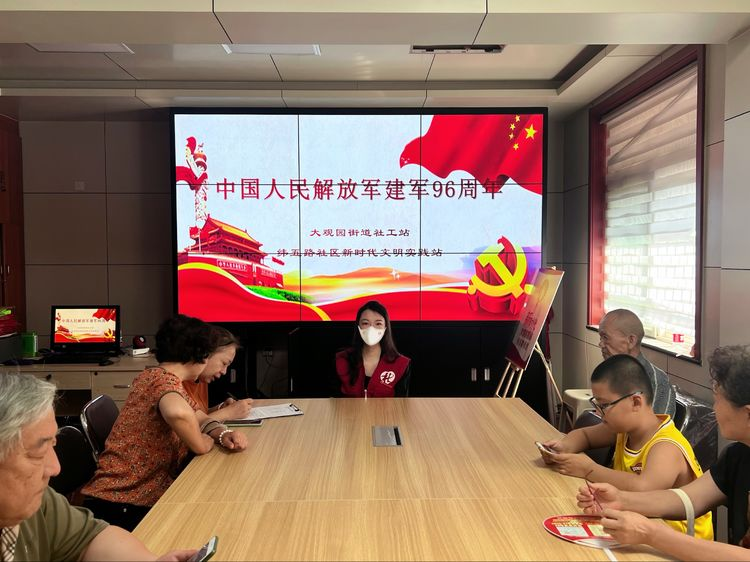 在2023年八一建军节到来之际,为了庆祝中国人民解放军成立96周年,弘扬革命传统,传承八一精神,8月1日上午,大观园街道社工站联合纬五路社区新时代文明实践站组织退休党员群众和家属共同观看红色电影《建军大业》。
