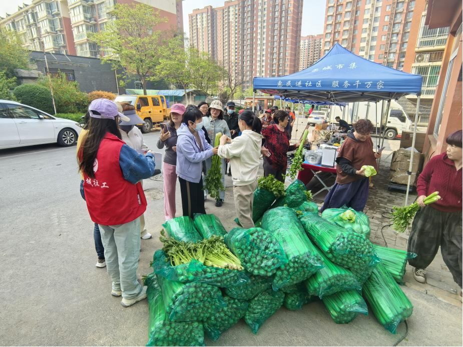 活动当天,公益市集早早开张,爱心企业带来了新鲜平价的蔬菜、水果和粮油产品,有枕头被褥、学习用品、传统的酱醋茶、内蒙古特产牛肉干、奶酪、哈尔滨红肠,再到香米糕、糖葫芦、手打山楂糕等小吃,以及苹果、果冻橙、莱阳梨等水果,并设置特惠专区,方便居民选购。社工站还联合社区志愿者,现场开展公益宣传,普及食品安全、垃圾分类等知识,倡导绿色健康的生活方式。活动现场特别设置了免费健康检测点,由专业医护人员为居民测量血压、血糖,并提供健康咨询。许多老年居民积极参与,纷纷表示:“这样的服务太贴心了,不用跑医院就能了解自己的身体状况,社工站真是想到我们心坎里了!”活动尾声,爱心企业向社区居民赠送了当季新鲜蔬菜,包括芹菜、白菜,传递了企业对社区的关怀。