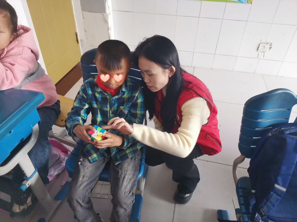 课堂上,志愿者季洪金首先讲解了魔方的诞生、结构以及种类,让孩子们对魔方有了初步认识。接着开始给孩子们演示魔方的左右手公式,每一个步骤、每一个动作,志愿者季老师都讲的非常详细,一边讲解一边做演示,孩子们认真听讲、仔细的模仿。在练习的过程中,社工们针对每个孩子出现的问题都耐心的指导,并引导孩子们之间建立了互相帮助关系,先学会的孩子帮助还不熟悉的孩子,这不仅保证了组员之间整体学习进度,更进一步提升孩子们之间的沟通交流。