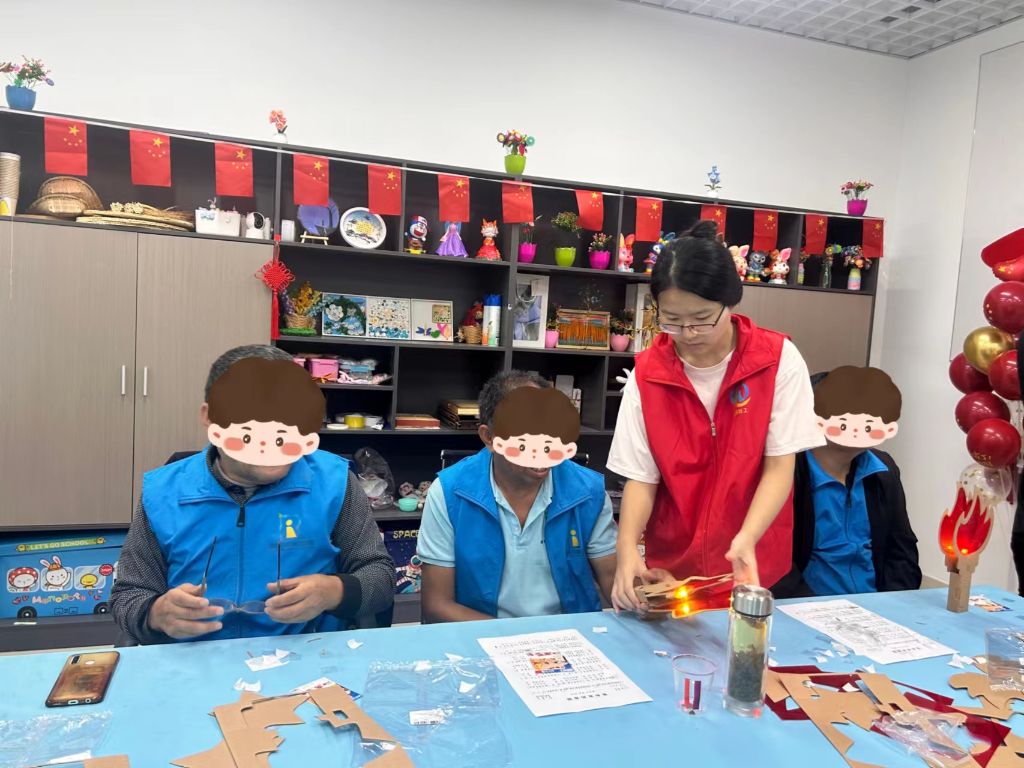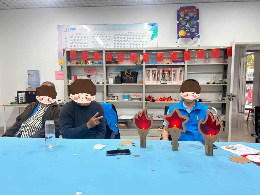活动现场被布置得温馨而热烈,到处洋溢着节日的气氛。随着活动的正式开始,大家在社工和志愿者的协助下,亲手制作了各种形状的国庆主题火炬,如星星、和平鸽等。他们细心地剪裁、粘贴,每一个细节都透露出对节日的庆祝和对美好生活的向往。通过手工制作,不仅让大家感受到了国庆的氛围,还锻炼了他们的动手能力和团队协作能力。