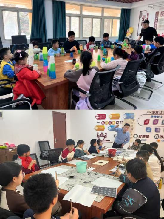 在活动组织过程中,社工充分发挥专业优势,根据孩子们的年龄特点和兴趣爱好,将活动科学合理地分为五个阶段,每节课程都邀请专业公益老师进行针对性指导和互动交流。比如在“笔墨丹青照古今”节次,社工引导孩子们书写春联、绘制福字。这一活动不仅让孩子们学习到书画知识,更让他们亲身感受到春节传统习俗的独特魅力。孩子们满怀热情地挥毫泼墨,一幅幅童趣盎然的春联和福字,既承载着他们对新年的美好憧憬,也让初次接触书画的孩子克服了陌生感和畏难情绪,在相互学习中共同进步。