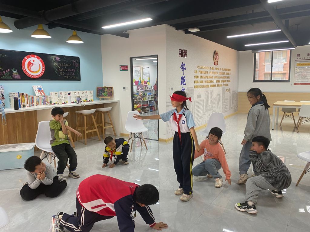 活动伊始,社工带领儿童开展了“红绿灯”热身游戏,儿童们首先通过“剪子包袱锤”决定谁蒙上眼睛站在中间,随后,游戏正式开始,其他儿童根据中间儿童的指令活动,“绿灯”正常绕圈走,“黄灯”扮成小动物的样子走,“红灯”停在原地不再移动。“红灯!”指令下达后,其他儿童停在原地,中间的儿童开始蒙着眼睛向周围摸索,其他儿童则采用“弯腰”“下蹲”“侧身”等各种各样的方式躲避。“我听到有人动的声音了”,“摸到了!”,第一轮游戏结束,被摸到的儿童成为了第二轮站到中间的儿童。经过四轮游戏,儿童的速度一次比一次快,总结的游戏技巧也越来越多,例如“蹲着摸”、“听哪有声音,朝着发出声音的方向摸”……现场气氛迅速活跃,在热身游戏结束后,很多儿童意犹未尽,社工及时对该环节进行总结,引导儿童将注意力转移到后面的游戏环节。