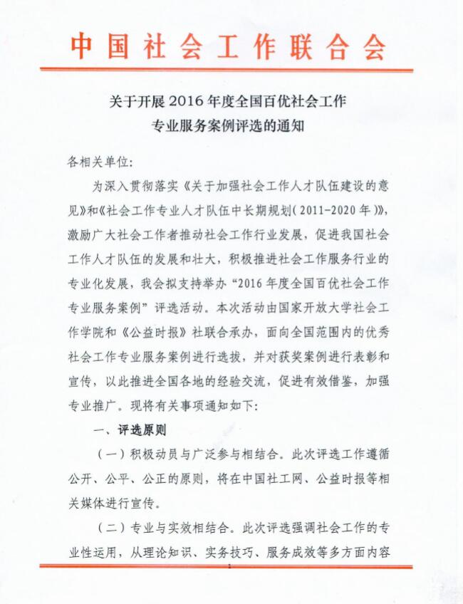 (转)关于开展2016年度全国百优社会工作专业服务案例评选的通知