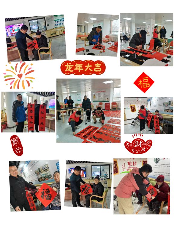 活动现场,社工们准备好了笔墨纸砚和春联纸,书法老师们在温馨和谐的氛围中展开创作“玉龙吐宝千重瑞,金莺报喜四时宁”、“大地流金万事通,冬去春来万象新”......一幅幅苍劲有力、洋溢着新春祝福的春联,在各位老师饱蘸热情的笔端精彩呈现,活动中社工全程协助书法老师完成铺纸、晾晒墨迹未干的春联等。现场翰墨飘香,热闹非凡,处处洋溢着暖暖的温情和喜庆的气氛。不一会儿,一幅幅漂亮的春联就完成了。社工和书法老师们将春联送给老人们,并与他们亲切交谈,询问他们的身体状况和生活情况。老人们接过春联,脸上洋溢着幸福的笑容,老人们纷纷表示感谢社工和书法老师的关心和祝福。