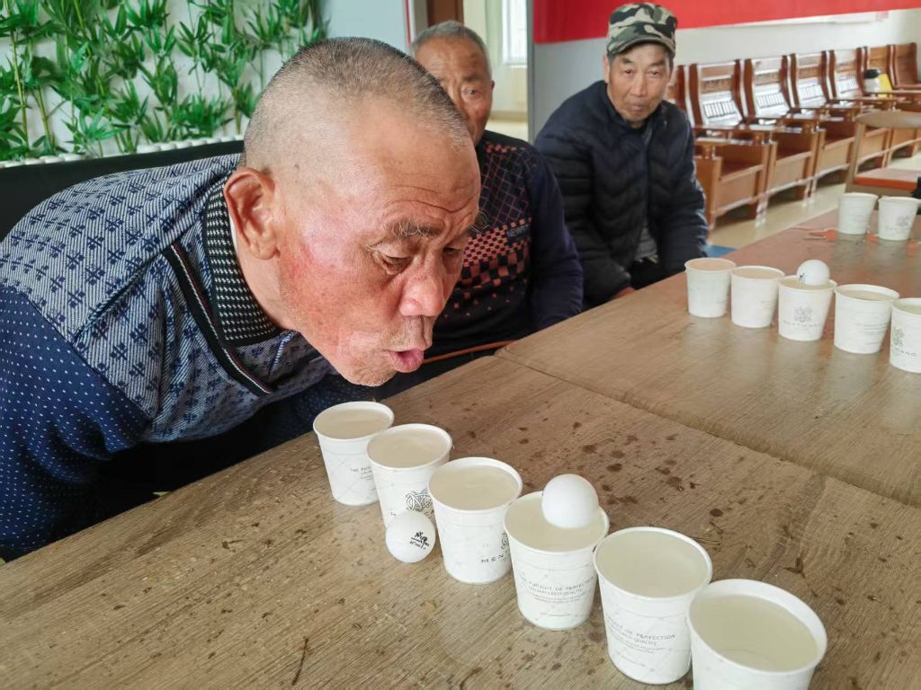 接下来进入感统游戏互动环节——“谁的乒乓球吹更远”,社工一边摆放活动物资,一边介绍游戏规则:参赛者需将乒乓球从第一个杯子吹到第五个杯子,过程中不能触碰杯子,乒乓球先吹到终点即为获胜,若乒乓球中途掉落则需重新开始。随着社工的哨声响起,组员们弯着腰,眼睛紧紧盯着乒乓球,腮帮子鼓得圆圆的,全力将球吹向下一个杯子。围观的组员也不甘示弱,大声为参赛者加油助威。组员王大爷在成功完成挑战后兴奋地说:“这个游戏太有趣了,我感觉自己又年轻了许多!”