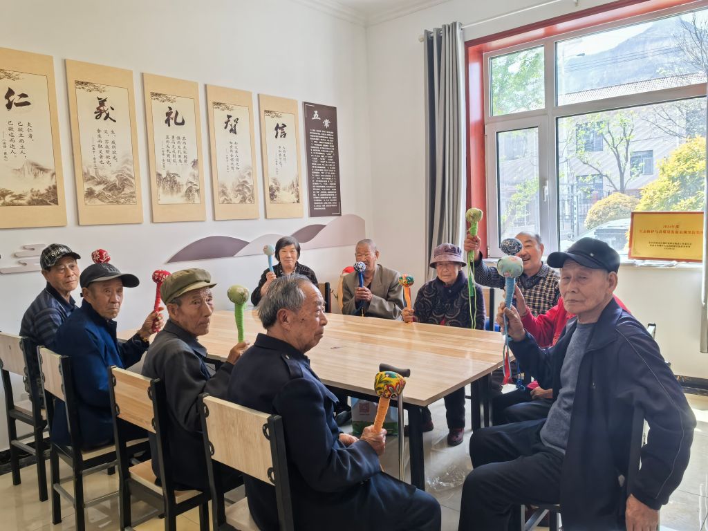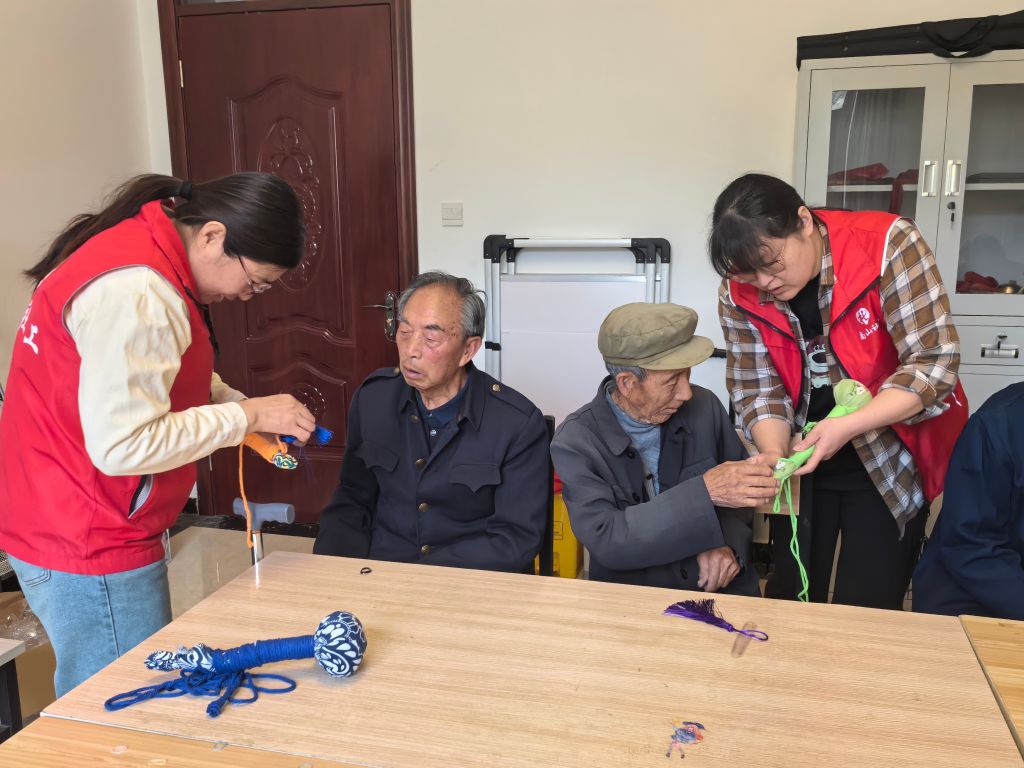 接着,社工现场示范养生锤的制作流程,每一个环节都讲解得详尽周到,从选择布料、填充艾叶到安装手柄等。有的老人戴上老花镜,拿起材料,在社工耐心的指导下开始了养生锤的制作。在制作过程中,老人们展现了他们的动手能力和创造力。有的老人手法熟练,缠线均匀,很快养生锤的雏形就呈现出来;有的老人虽然动作稍慢,但眼神中透露出专注和认真,遇到问题时会主动向社工或同伴求助。大家一边制作,一边交流养生经验,分享生活趣事,现场气氛既热烈又和谐。经过一个多小时的努力,老人们手中诞生了一个个散发着艾草香味的养生锤。看着自己亲手制作的养生锤,老人们脸上洋溢着自豪和满足的笑容。77岁的孙大爷兴奋地说:“这个活动太有意义了,不仅让我学会了制作养生锤,还能在家自己使用它进行按摩,真是太实用了。和大家一起动手制作,让我感觉回到了年轻时代,非常开心。”